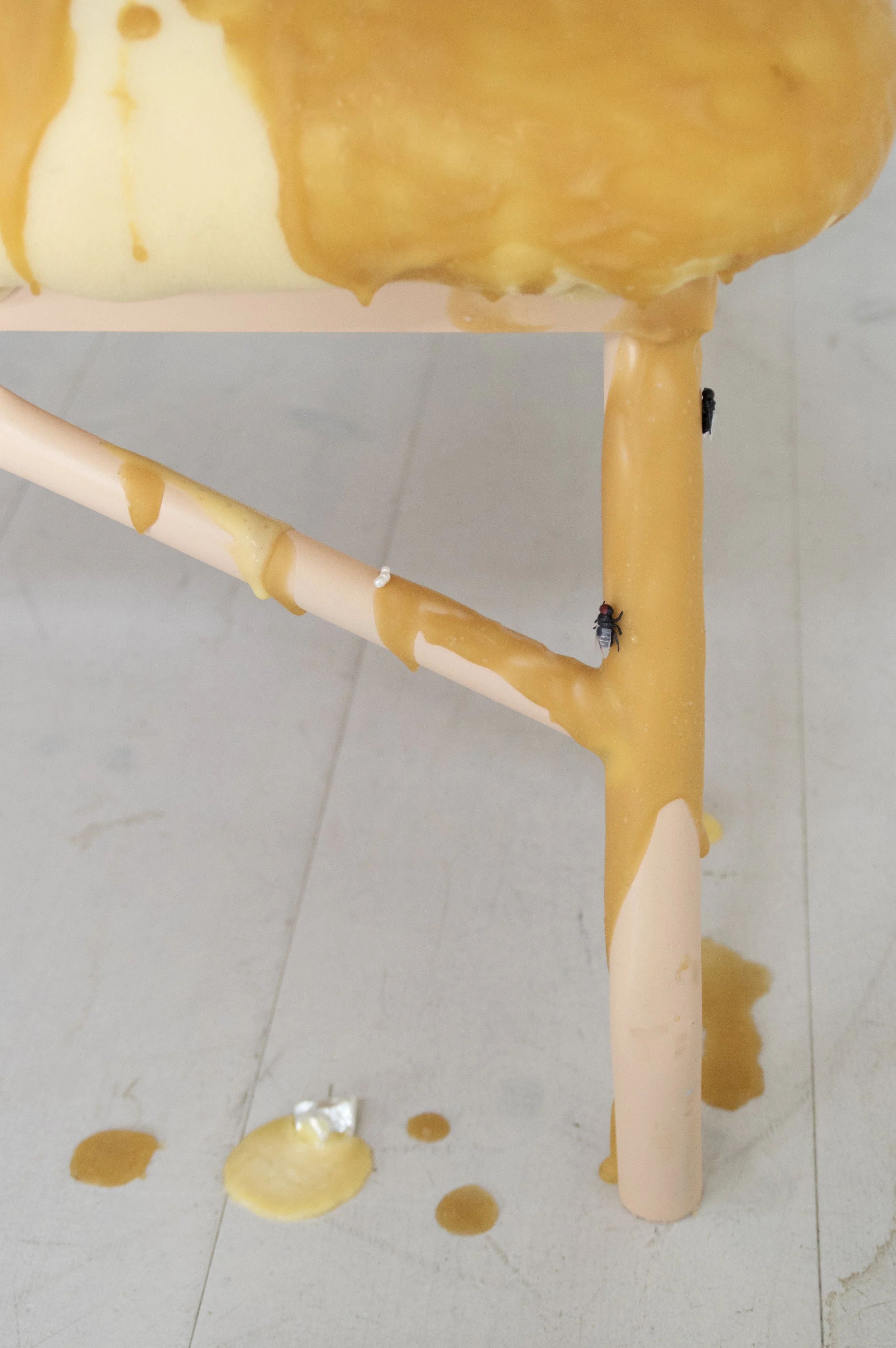 A central sculpture, covered in raw upholstery and latex, resembles a peeled surface that reveals inner layers of under-skin, decomposition, and hidden structures. Like a shell opening, it suggests the unveiling of either precious pearls or mere sand.