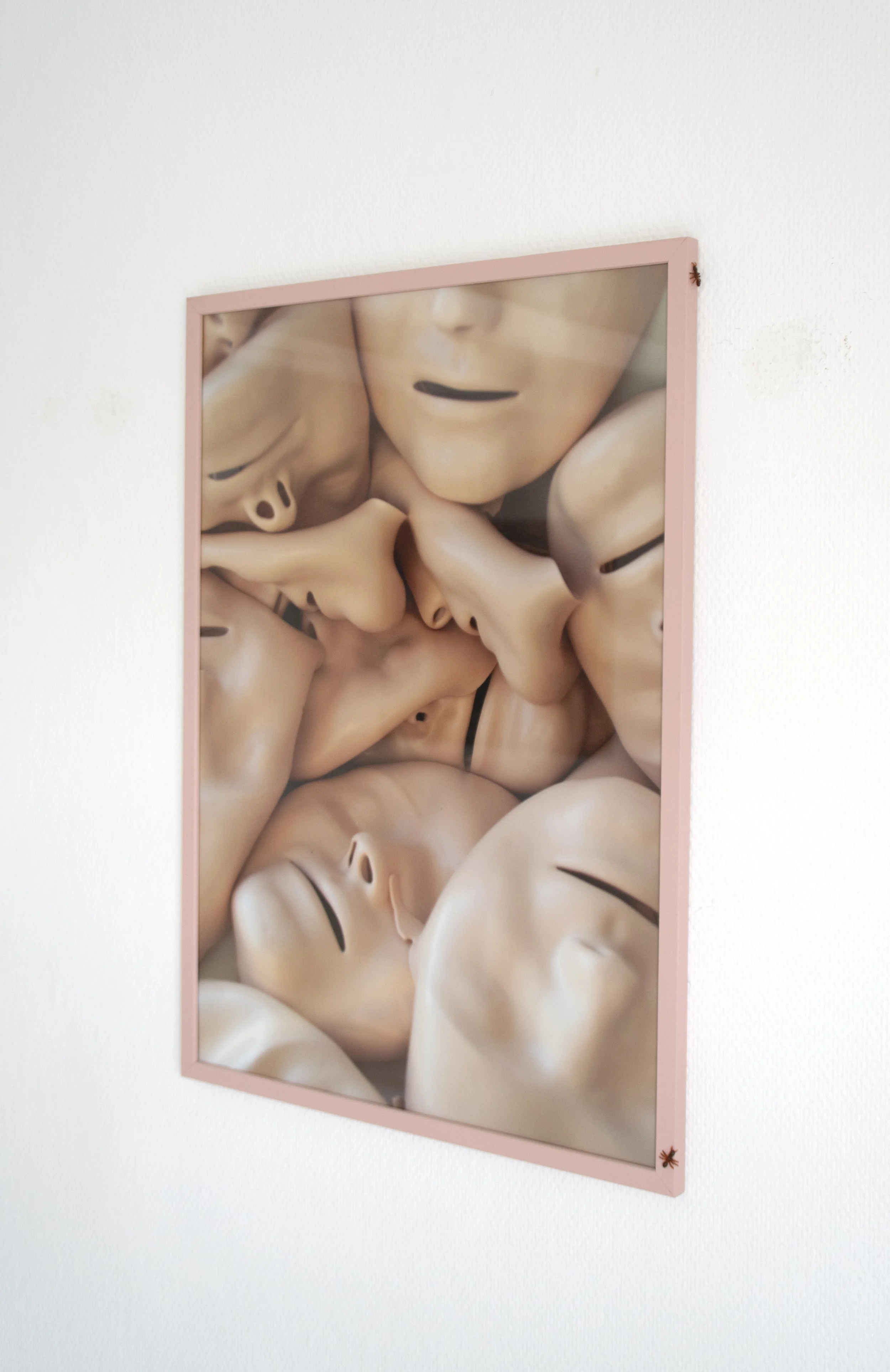 The exhibition Sirene explores photography in the expanded field, where materiality and three-dimensionality are used to challenge and extend the medium. The works appear as reliefs, with frames made from bonded foam, upholstery, and latex, which function as integral parts of the expression. Ornamented with insects and freshwater pearls, they highlight the tension between vanity and decay, ornament and transience.